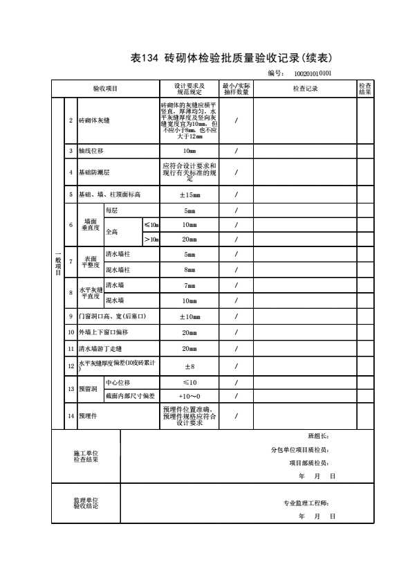 表格名称:100201010101 砖砌体检验批质量验收记录