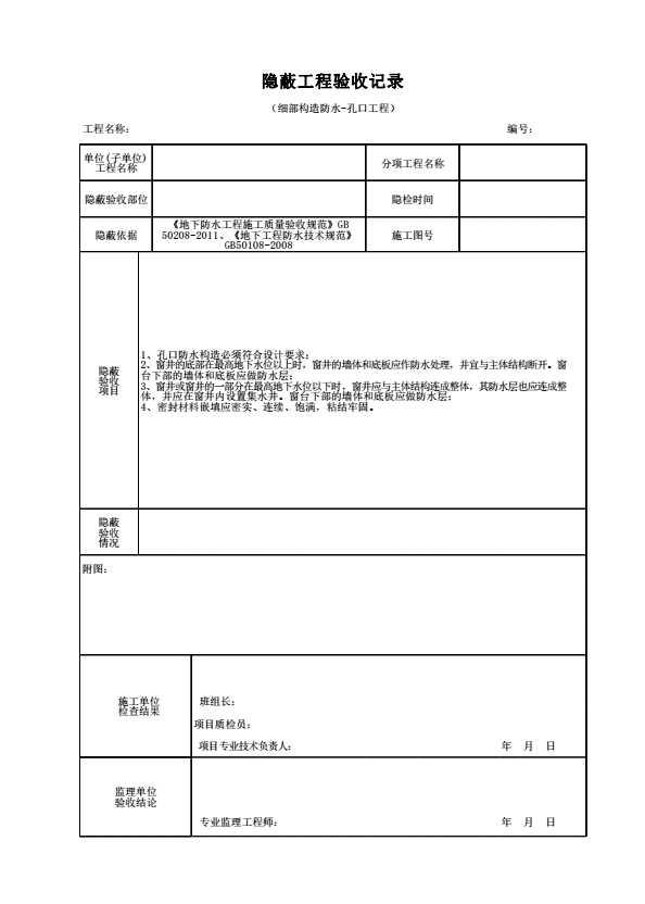 表格名称:隐蔽工程验收记录(细部构造防水-孔口工程)