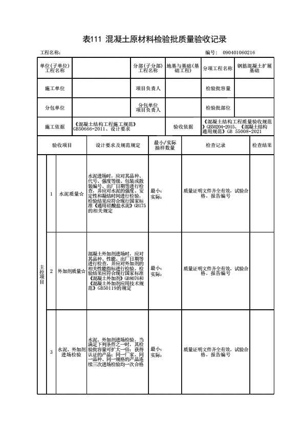 表格名称:090401060216 混凝土原材料检验批质量验收记录