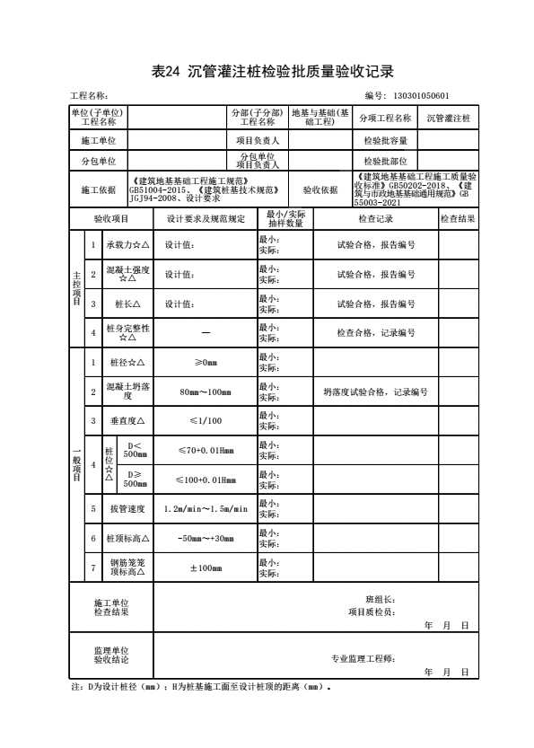 表格名称:130301050601 沉管灌注桩检验批质量验收记录
