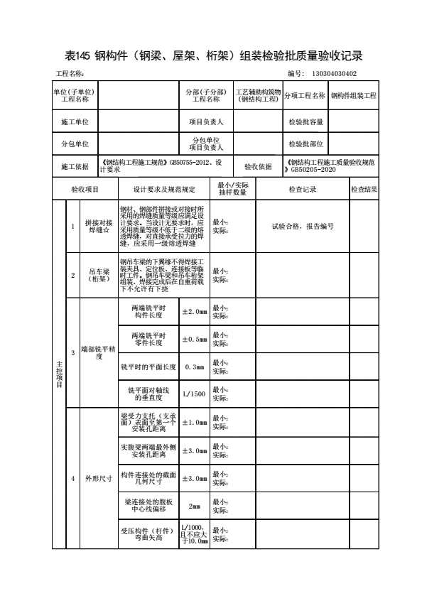 表格名称:130304030402 钢构件(钢梁、屋架、桁架)组装检验批质量验收记录