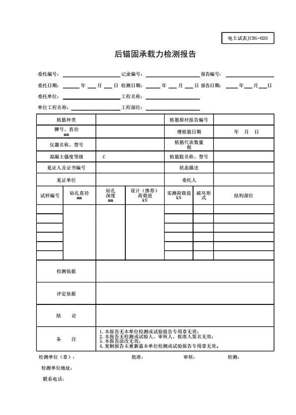 表格名称:电土试表JCBG-026 后锚固承载力检测报告