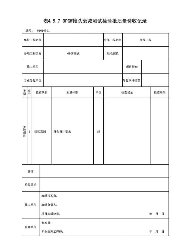 表格名称:表4.5.7 OPGW接头衰减测试检验批质量验收记录