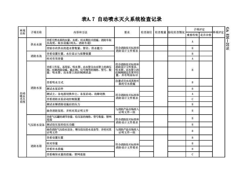 表格名称:表A.7 自动喷水灭火系统检查记录
