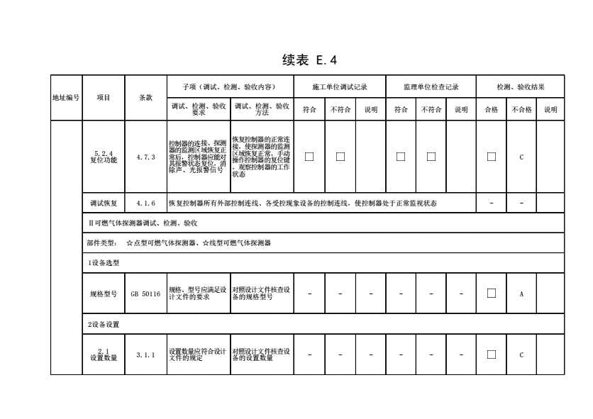 表格名称:表E.4 可燃气体探测报警系统调试、检测、验收记录(续表13)