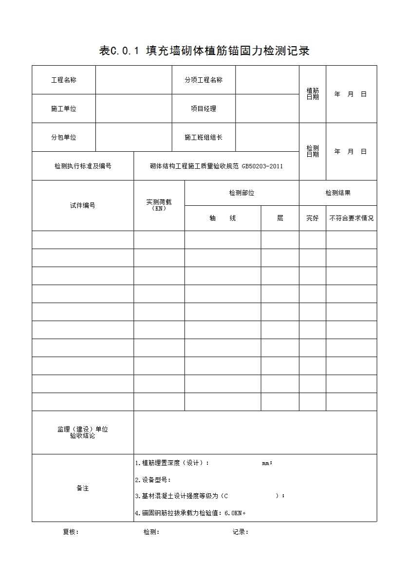 表格名称:表C.0.1 填充墙砌体植筋锚固力检测记录