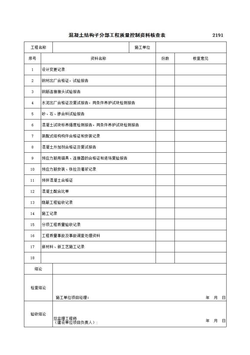 表格名称:2191 混凝土结构子分部工程质量控制资料核查表