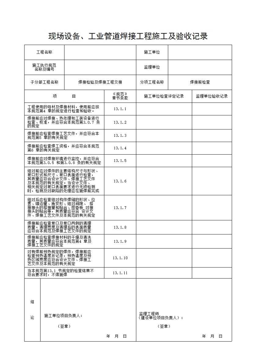 表格名称:焊接检验及焊接工程交接(焊接前检查)