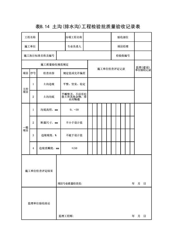 表格名称:表B.14 土沟(排水沟)工程检验批质量验收记录表