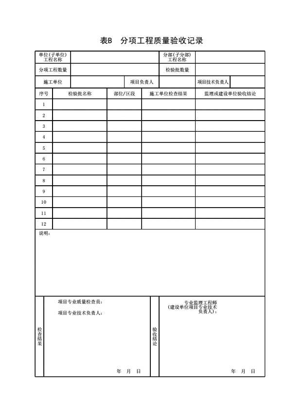 表格名称:表B分项工程质量验收记录