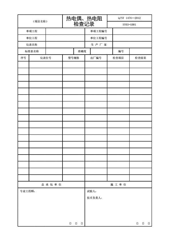 表格名称:SY03-G001 热电偶、热电阻检查记录