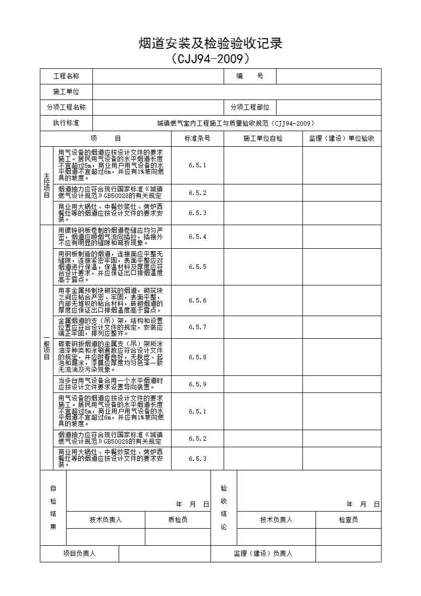 6.5.1 用气设备的烟道应按设计文件的要求施工。居民用气设备的水平烟道长度不宜超过5m,商业用户用气设备的水平烟道不宜超过6m,并应有1%坡向燃具的坡度。