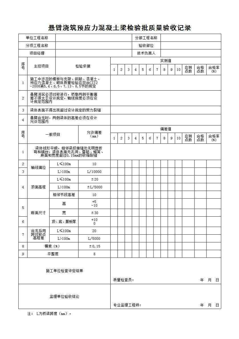 表格名称:悬臂浇筑预应力混凝土梁检验批质量验收记录