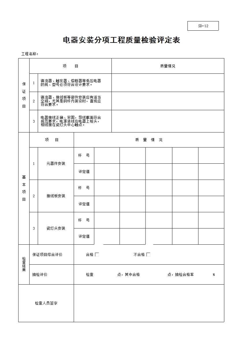 表格名称:电器安装分项工程质量检验评定表