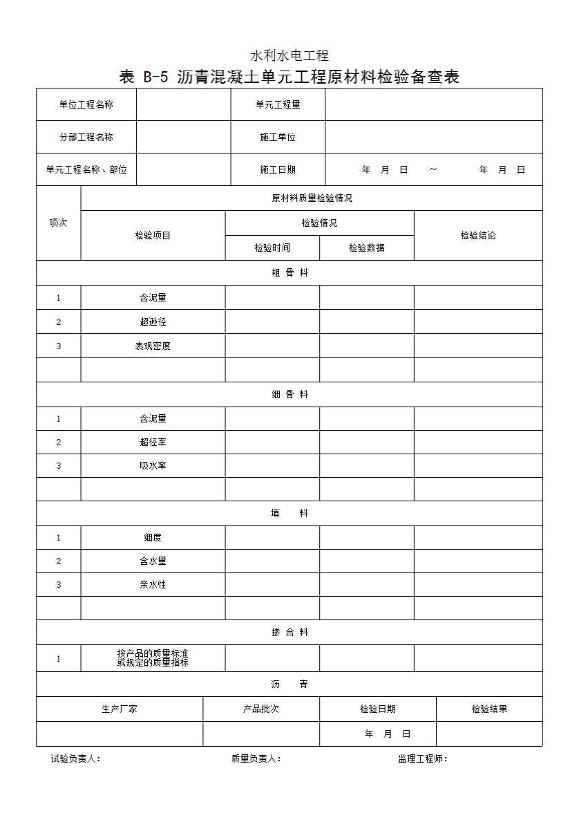 表格名称:表 B-5 沥青混凝土单元工程原材料检验备查表