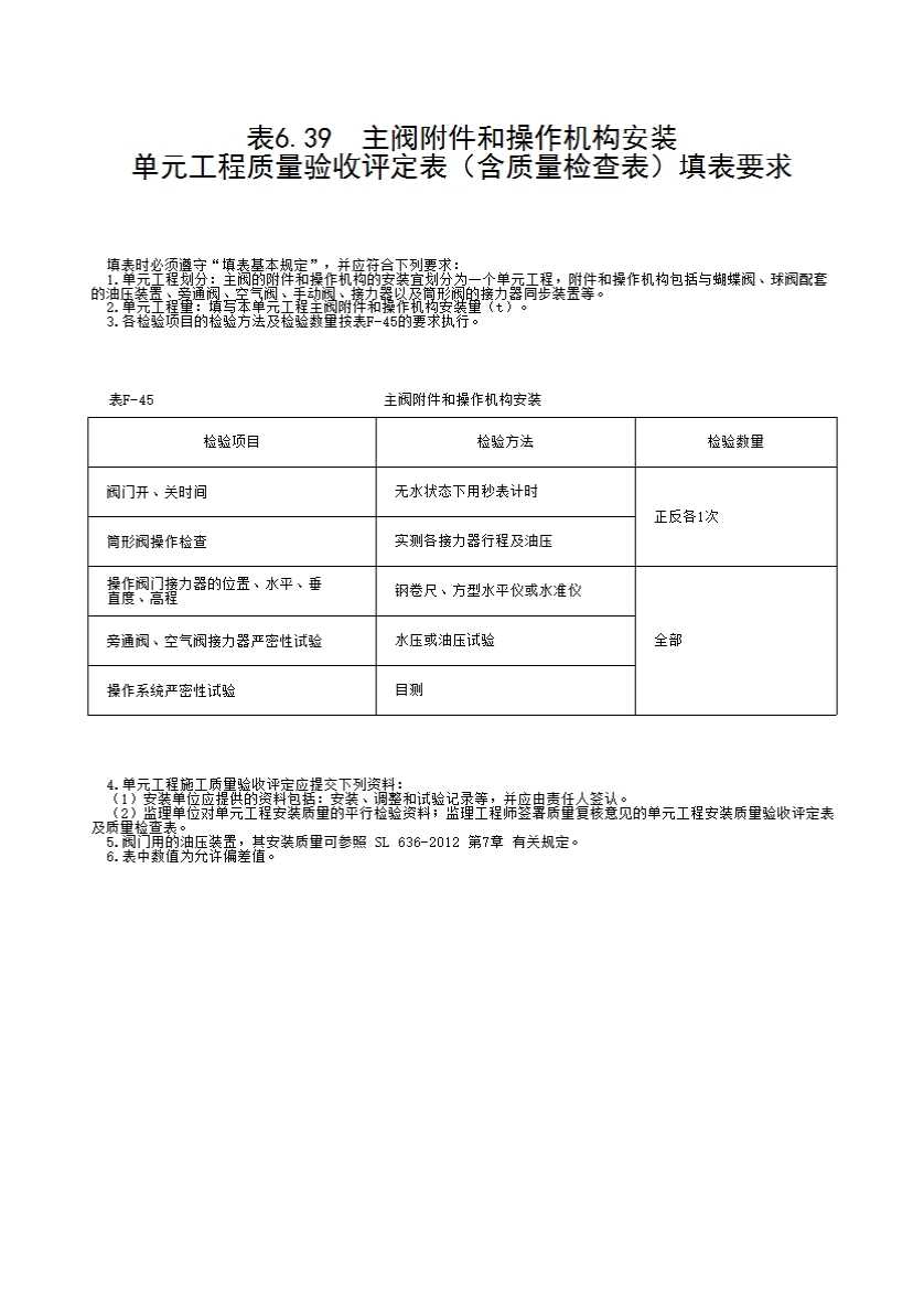 表6.39  主阀附件和操作机构安装单元工程质量验收评定表(含质量检查表)填表要求