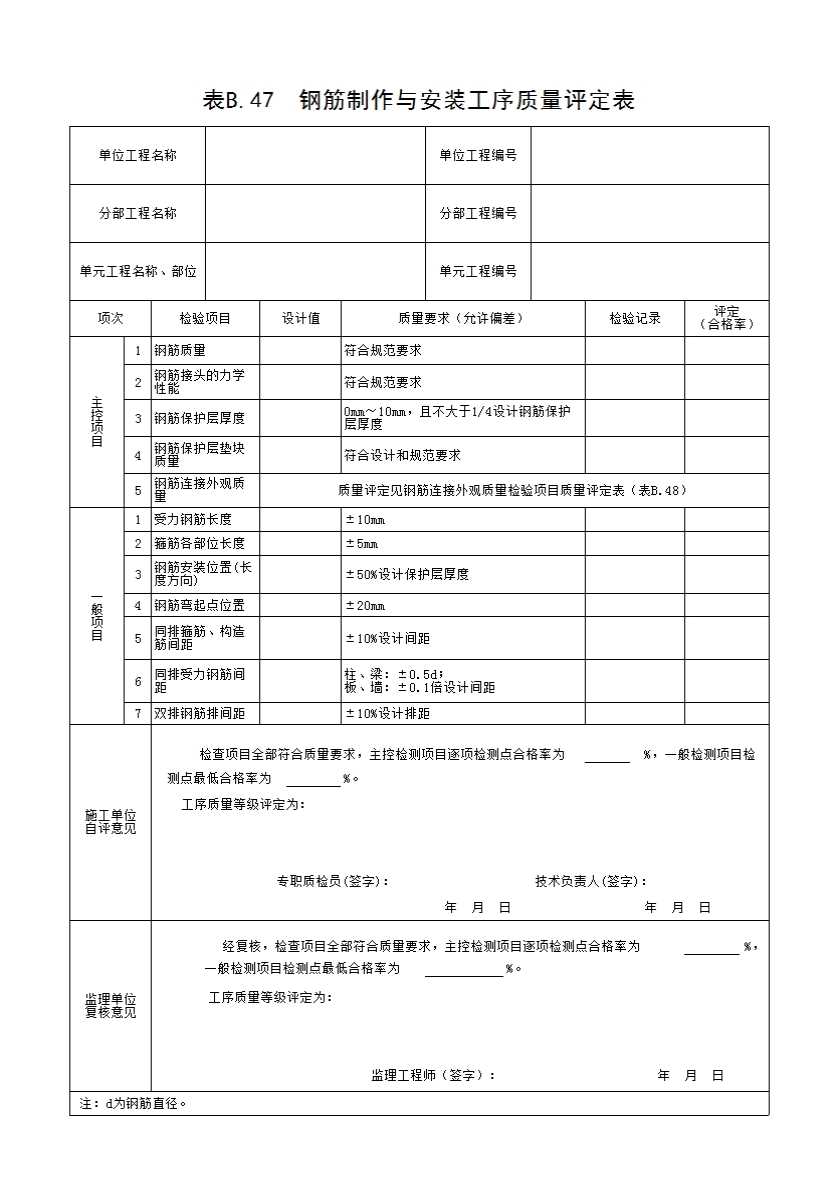 表格名称:表B.47 钢筋制作与安装工序质量评定表