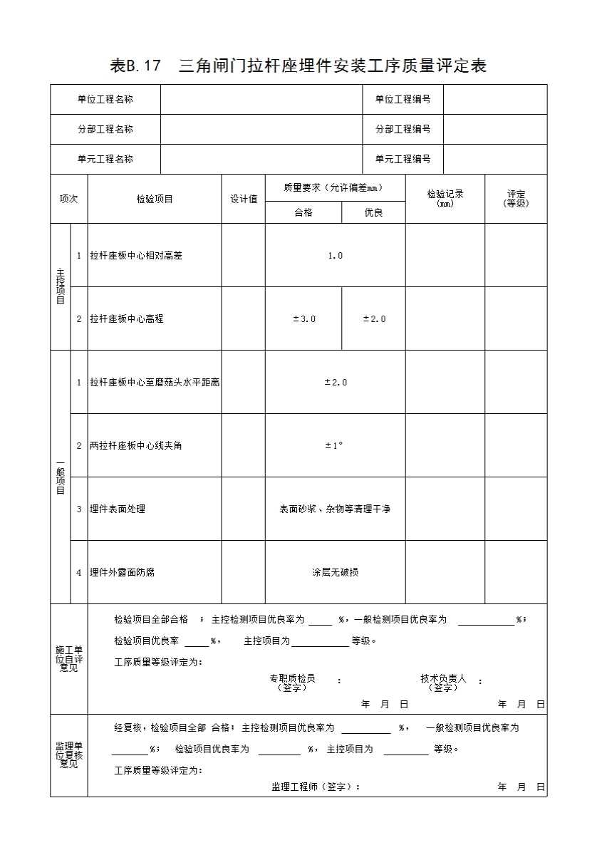表格名称:表B.17 三角闸门拉杆座埋件安装工序质量评定表