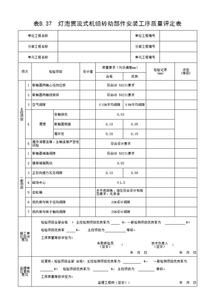 表格名称:表B.37 灯泡贯流式机组转动部件安装工序质量评定表
