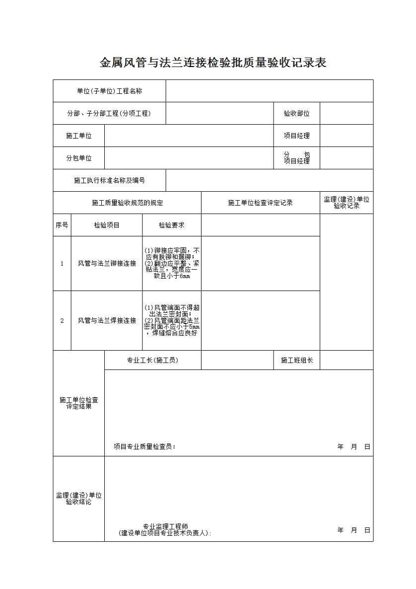 表格名称:金属风管与法兰连接检验批质量验收记录表