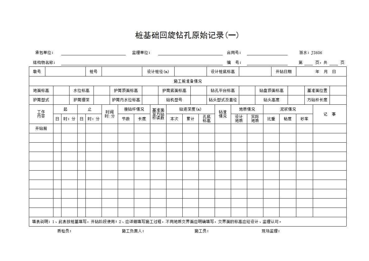 表格名称:006 桩基础回旋钻孔原始记录(一)