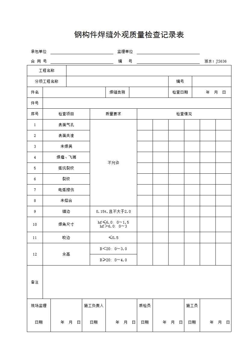 表格名称:036 钢构件焊缝外观质量检查记录表
