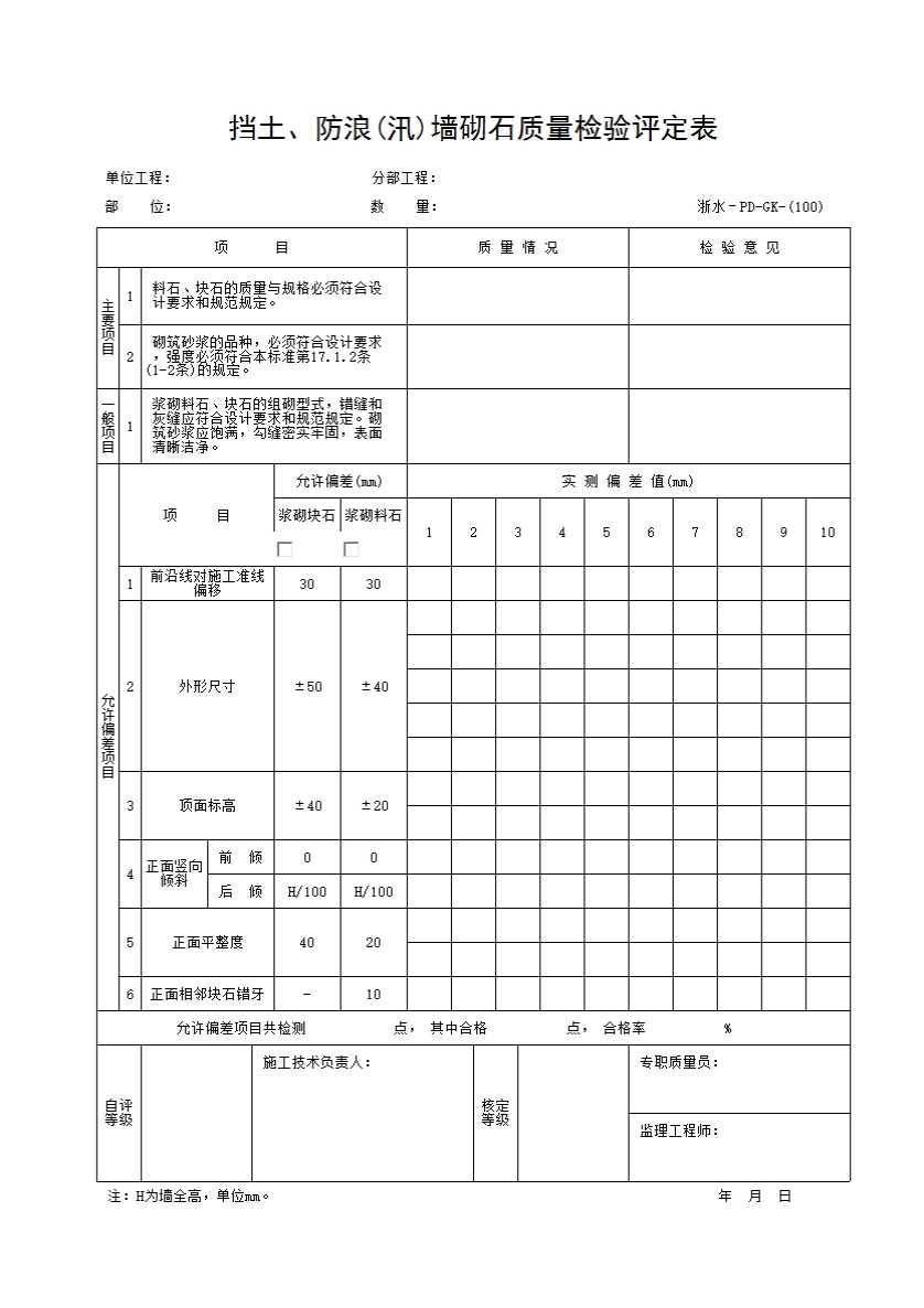 表格名称:100 挡土、防浪(汛)墙砌石质量检验评定表