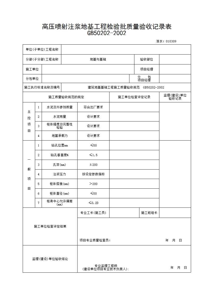表格名称:019 高压喷射注浆地基工程检验批质量验收记录表