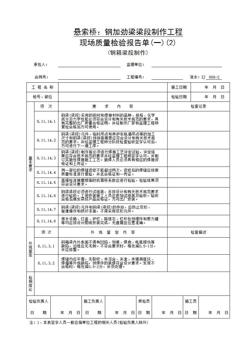 表格名称:浙水:ZJ888-2 悬索桥:钢加劲梁梁段制作工程现场质量检验报告单(一)(2)