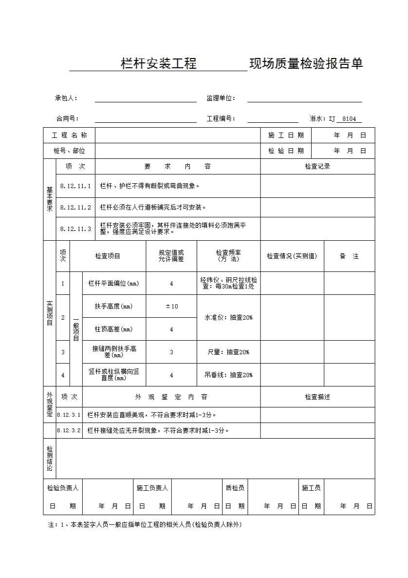 表格名称:浙水:ZJ8104 栏杆安装工程现场质量检验报告单