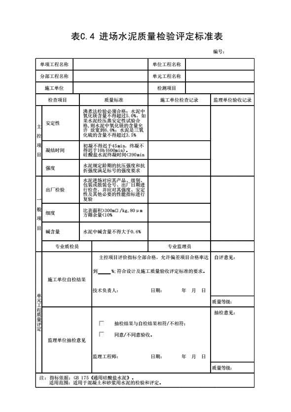 表格名称:表C.4 进场水泥质量检验评定标准表