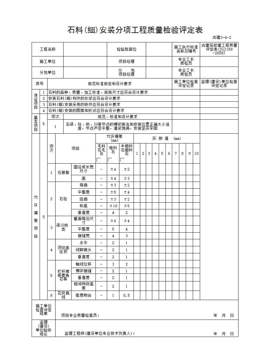 表格名称:古建3-4-2 石料(细)安装分项工程质量检验评定表