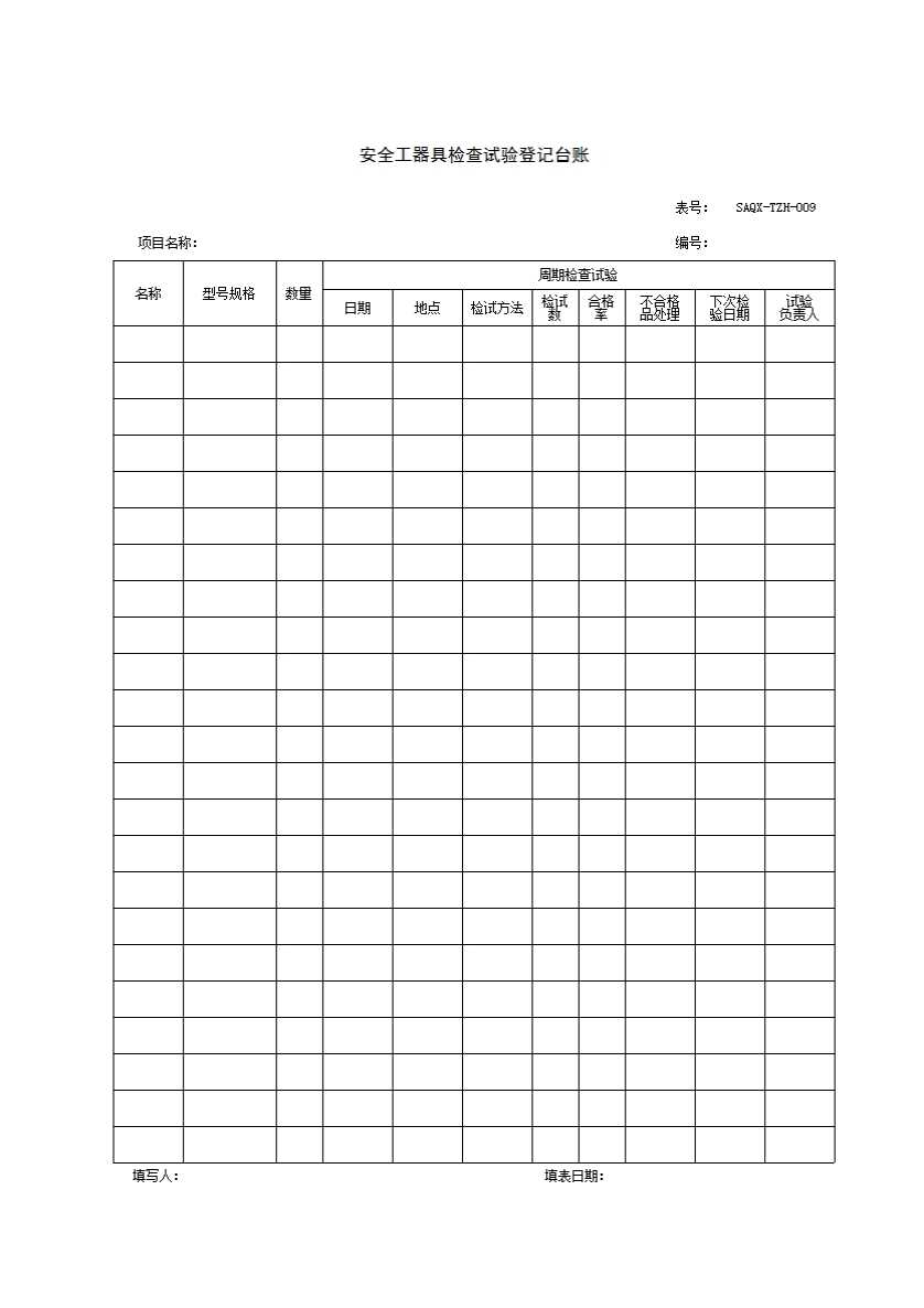 SAQX-TZH-009 安全工器具检查试验登记台账