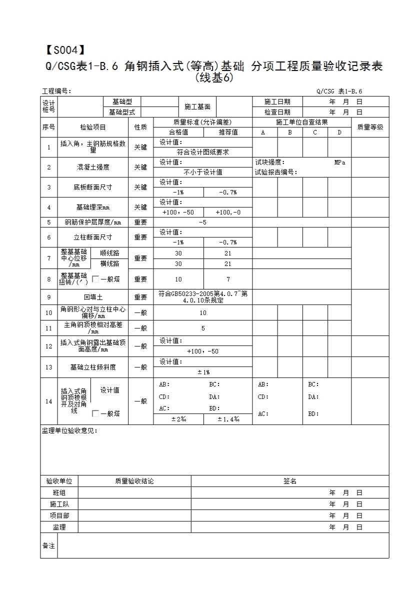 表格名称:QCSG 表 1-B.6 角钢插入式(等高)基础 分项工程质量验收记录表(线基6)