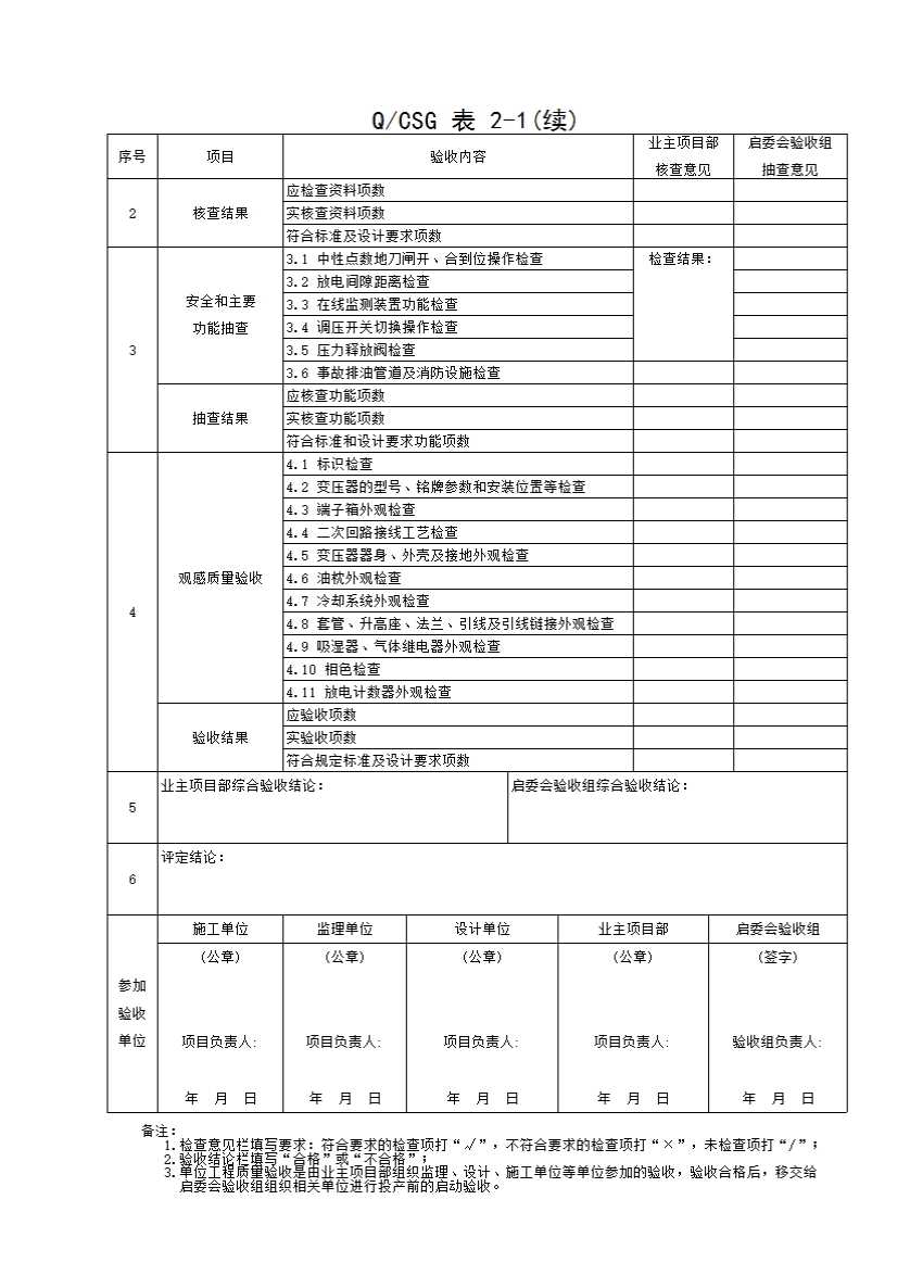 QCSG 表 2-1 主变压器系统设备安装 单位(子单位)工程质量验收与评定记录表