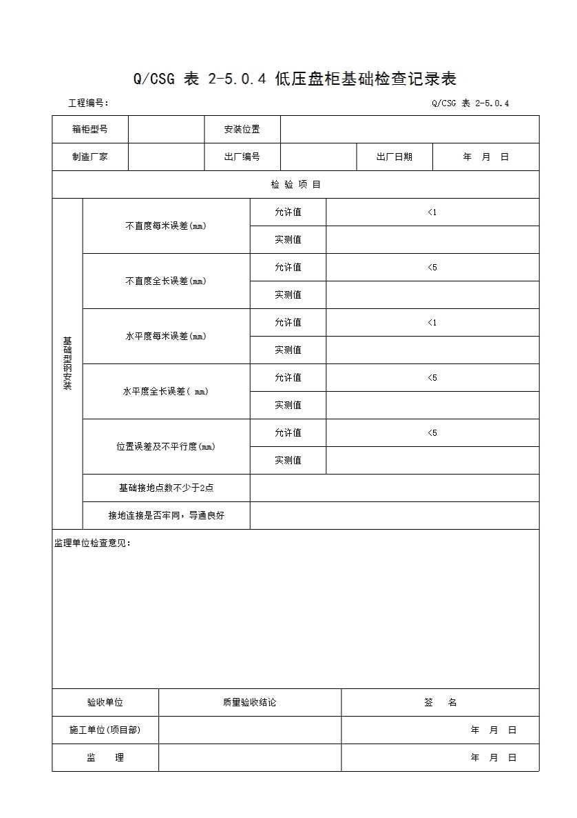表格名称:QCSG 表 2-5.0.4 低压盘柜基础检查记录表