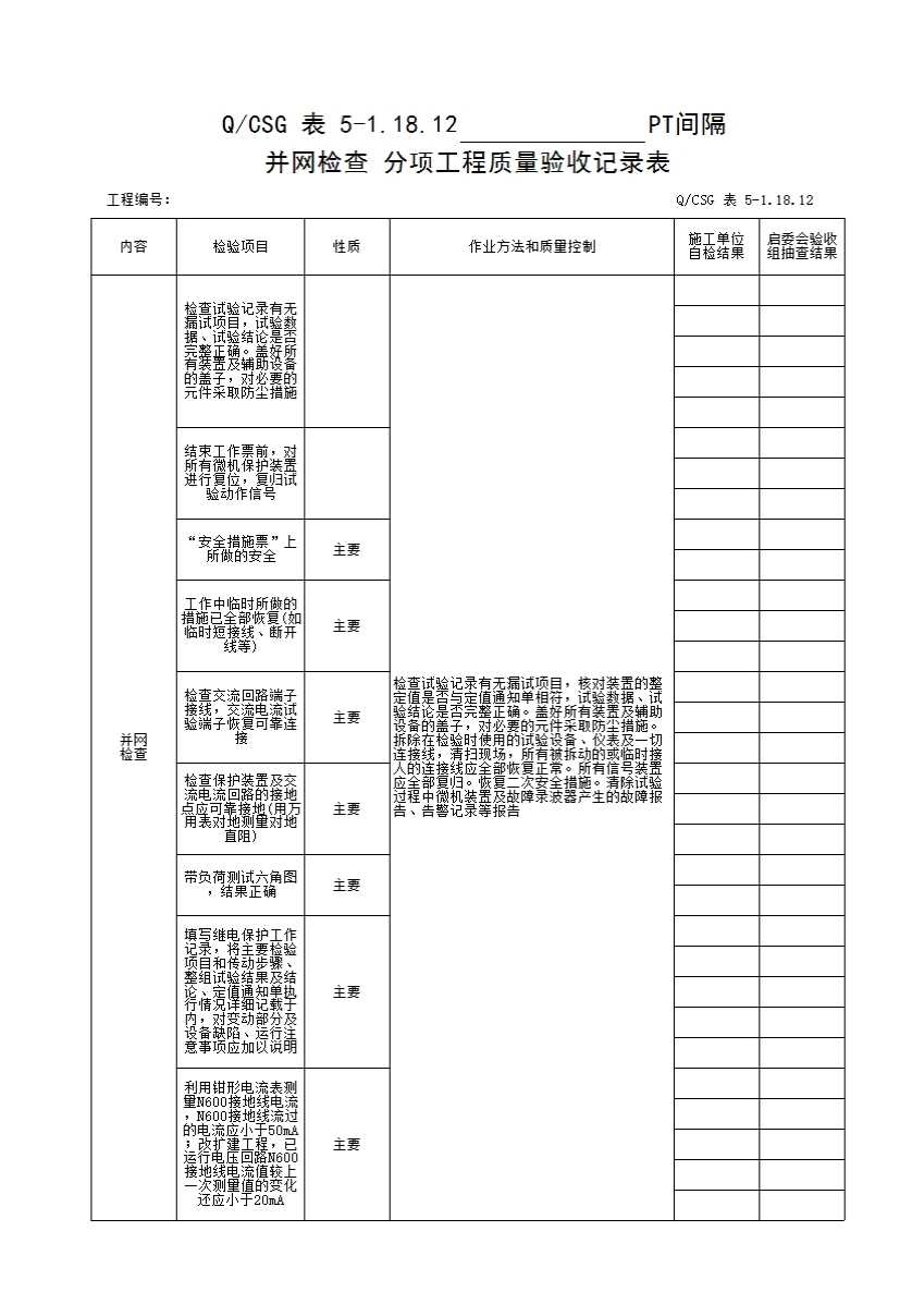 表格名称:QCSG 表 5-1.18.12 ______PT间隔并网检查 分项工程质量验收记录表