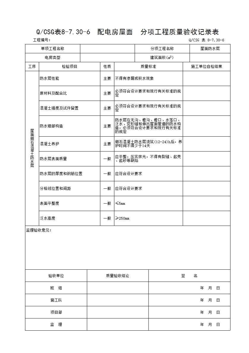表格名称:QCSG 表 8-7.30-6 配电房屋面 分项工程质量验收记录表