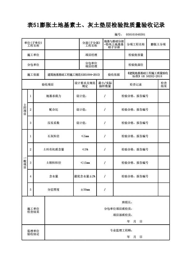表格名称:050101040301 膨胀土地基素土、灰土垫层检验批质量验收记录