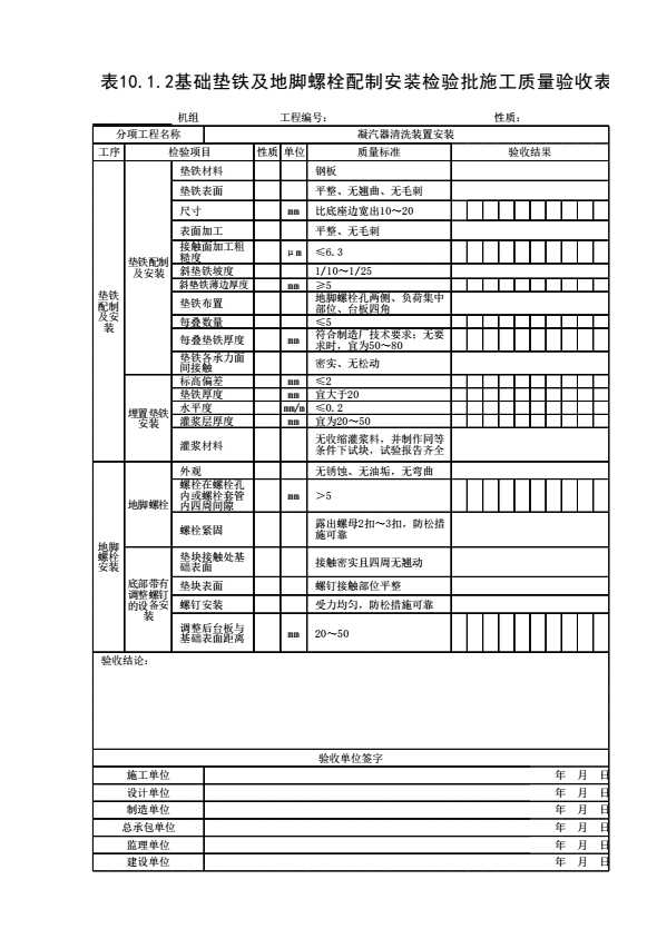 表格名称:表10.1.2 基础垫铁及地脚螺栓配制安装检验批施工质量验收表