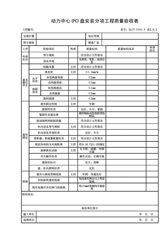 表格名称:表2.0.2 动力中心(PC)盘安装分项工程质量验收表