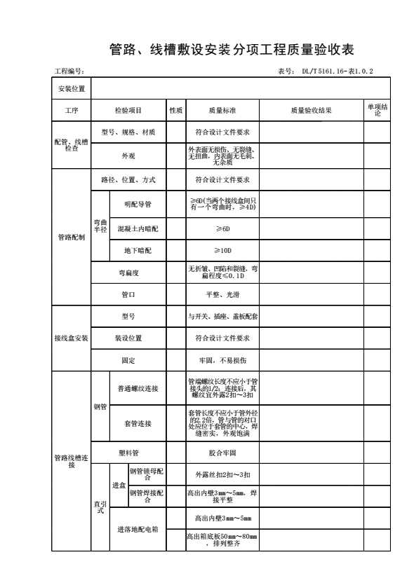 表1.0.2 管路、线槽敷设安装分项工程质量验收表