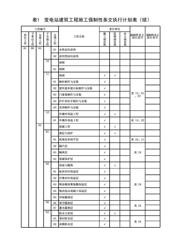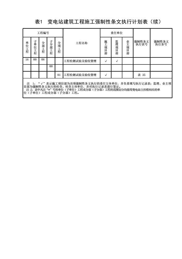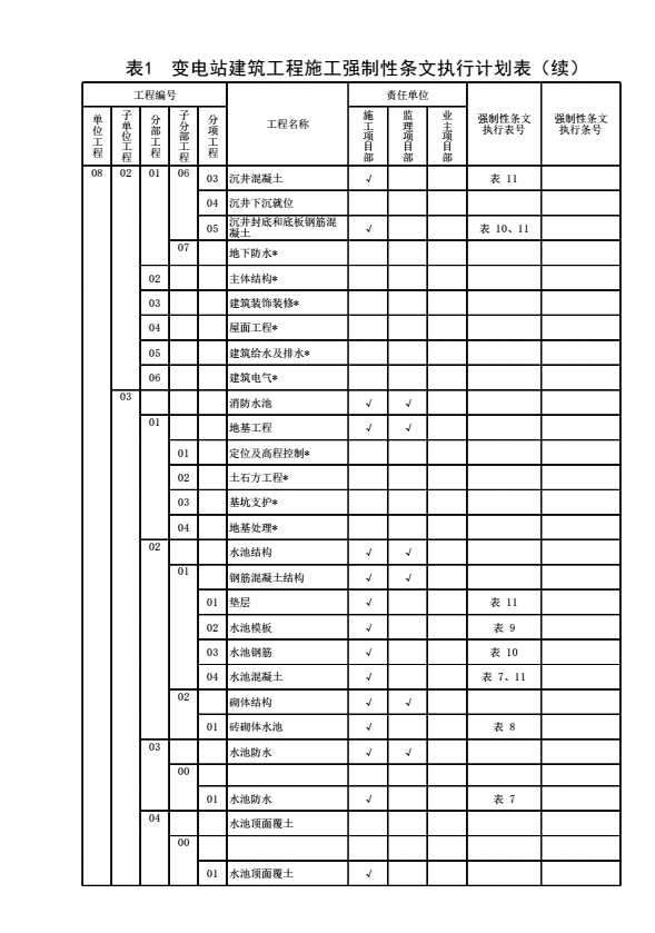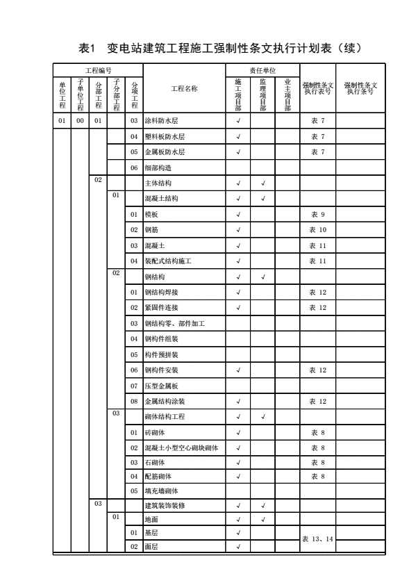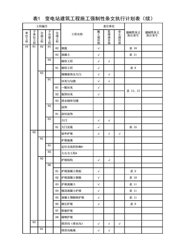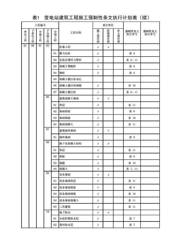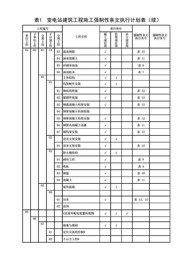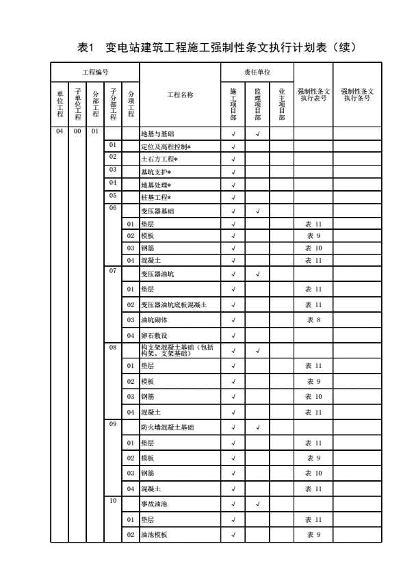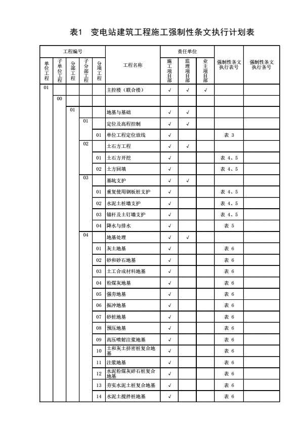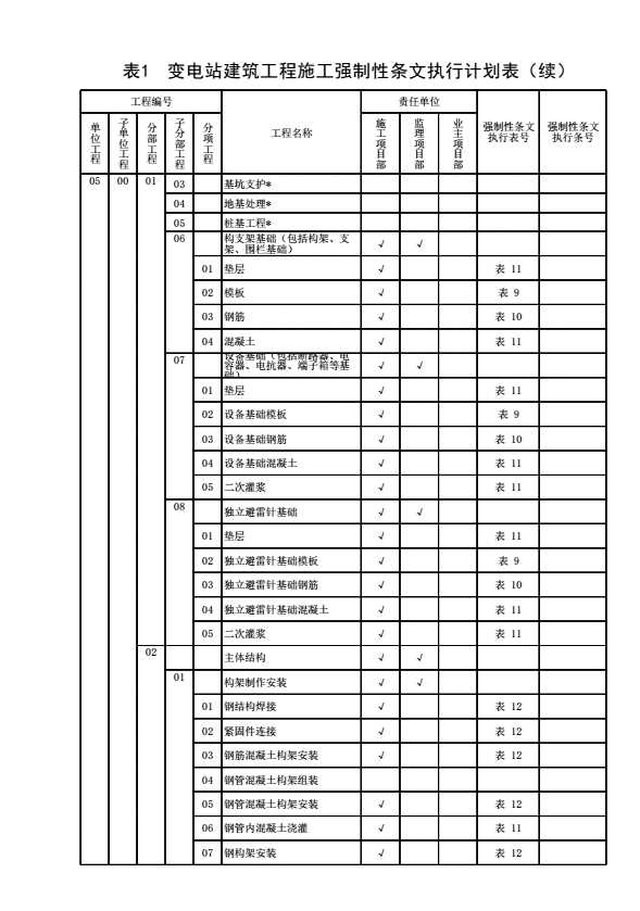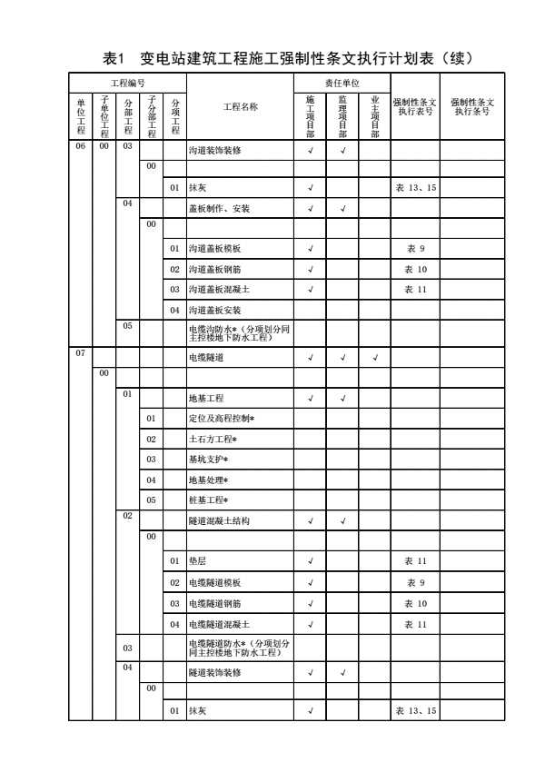 表格名称:表1 变电站建筑工程施工强制性条文执行计划表