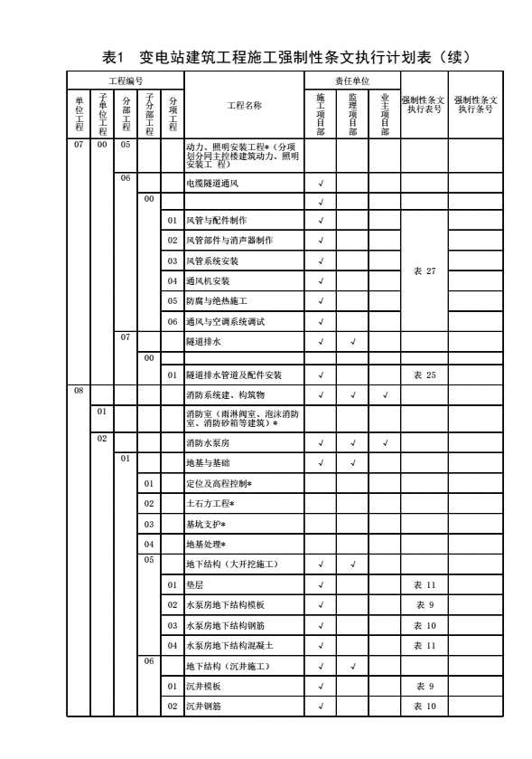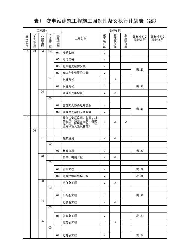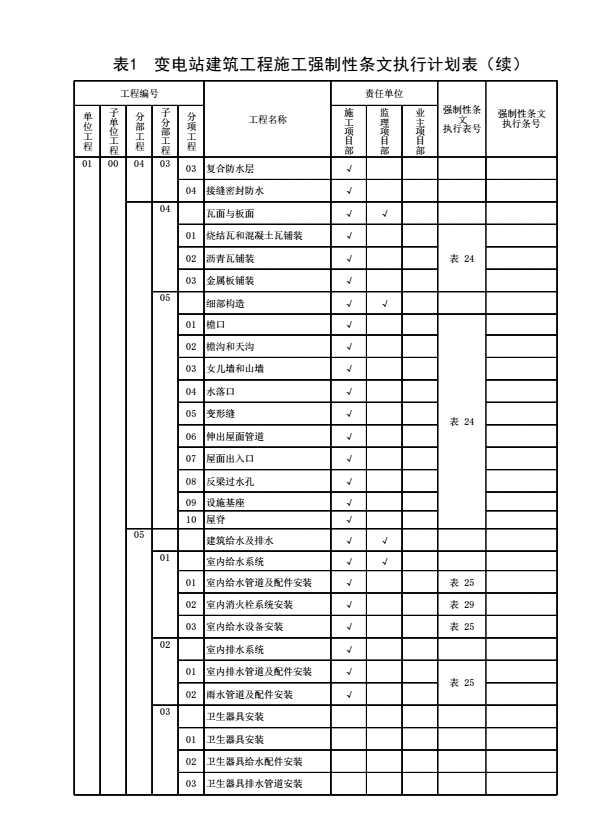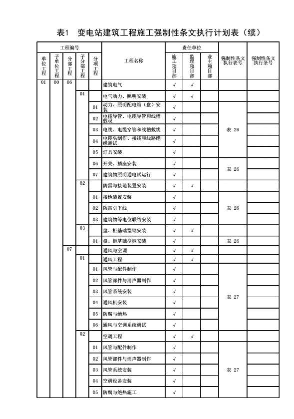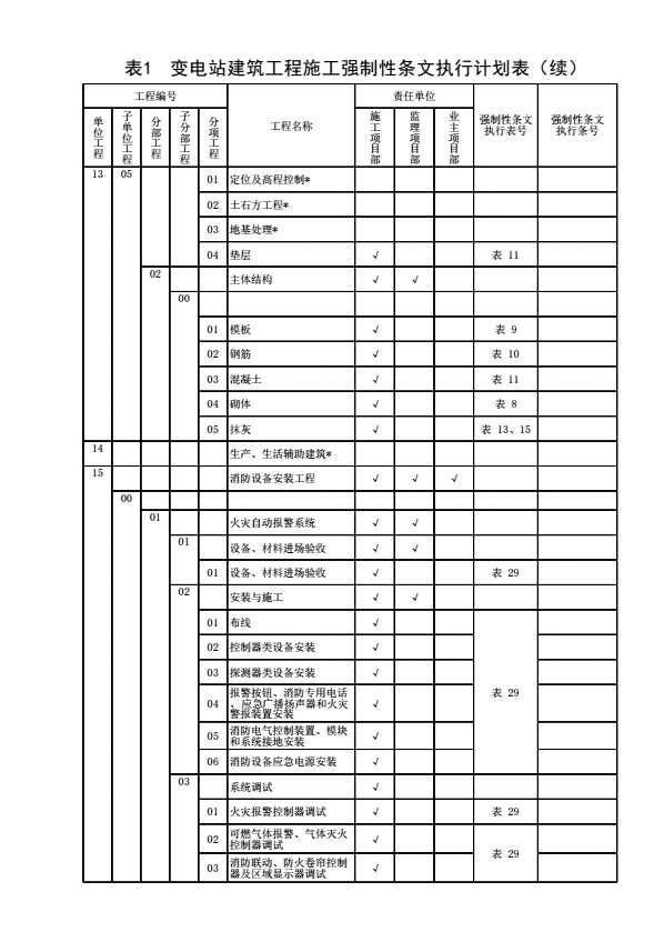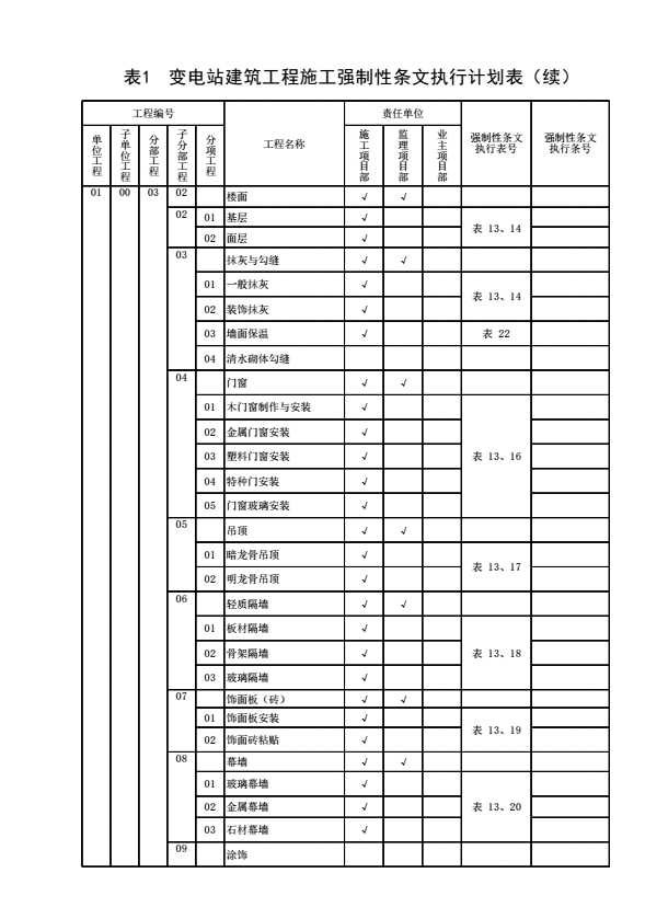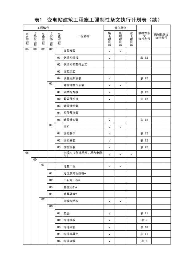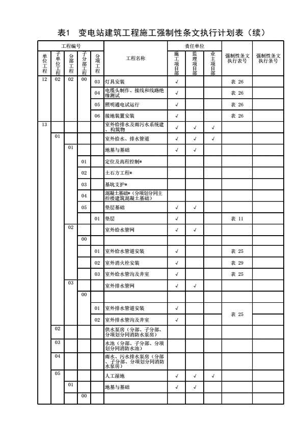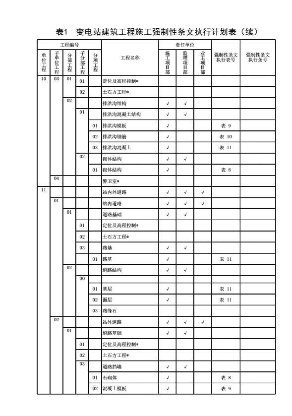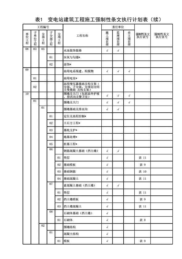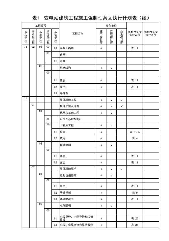 表格名称:表1 变电站建筑工程施工强制性条文执行计划表