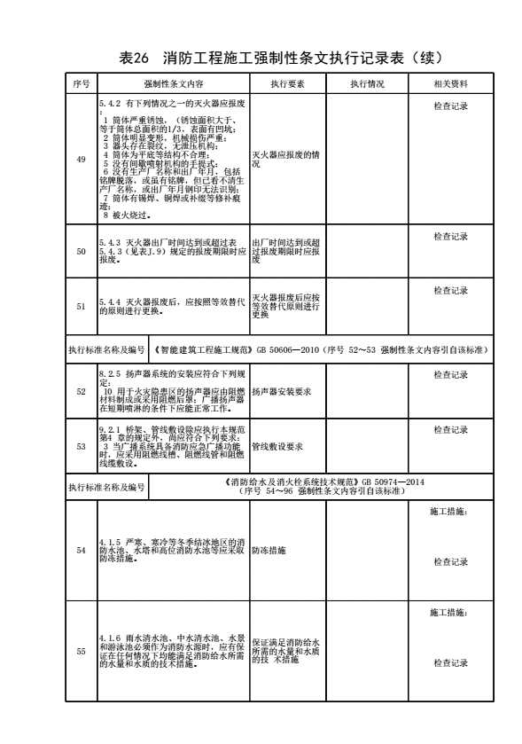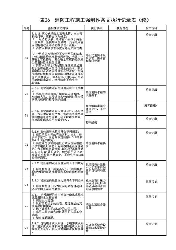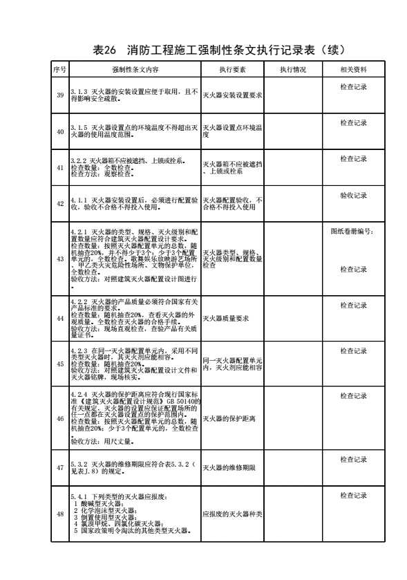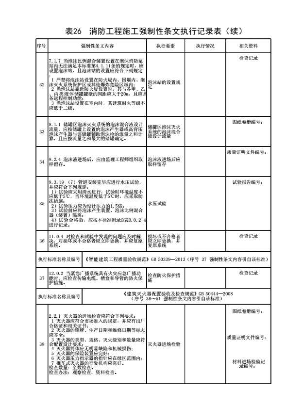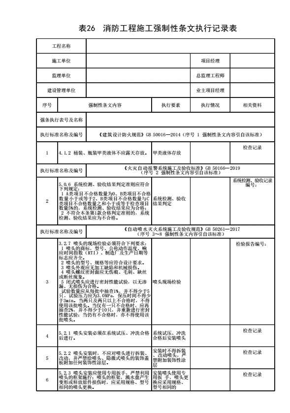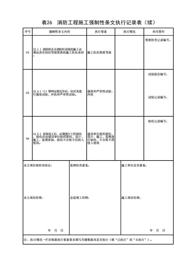 表格名称:表26 消防工程施工强制性条文执行记录表
