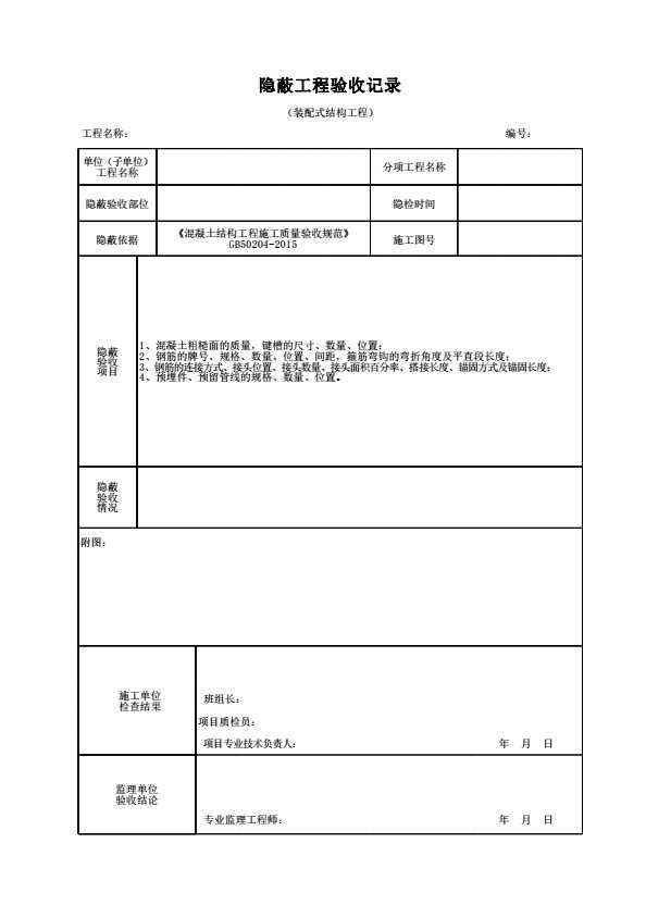 表格名称:隐蔽工程验收记录(装配式结构工程)