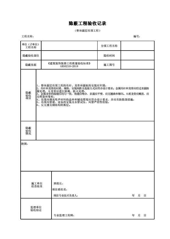 表格名称:隐蔽工程验收记录(整体面层吊顶工程)