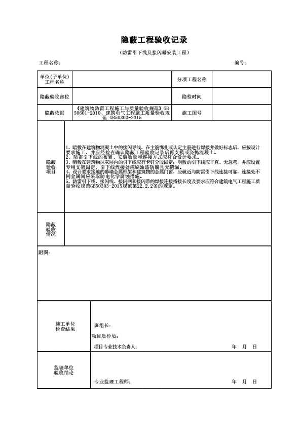 表格名称:隐蔽工程验收记录(防雷引下线及接闪器安装工程)