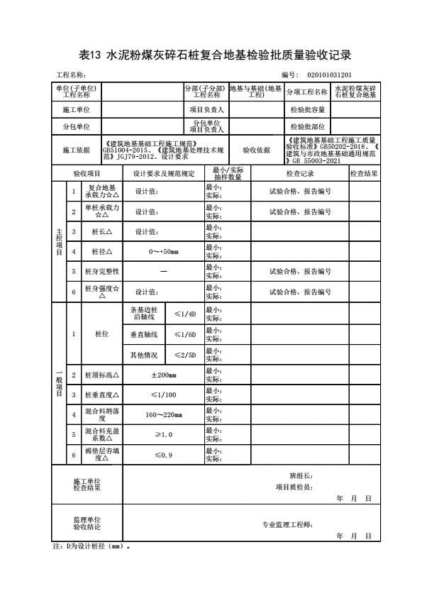 表格名称:020101031201 水泥粉煤灰碎石桩复合地基检验批质量验收记录