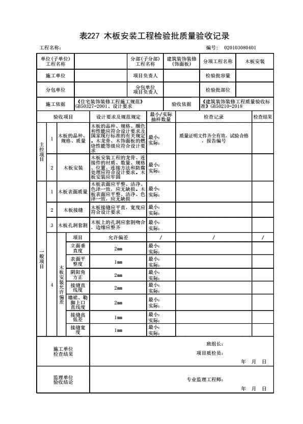 表格名称:020103080401 木板安装工程检验批质量验收记录